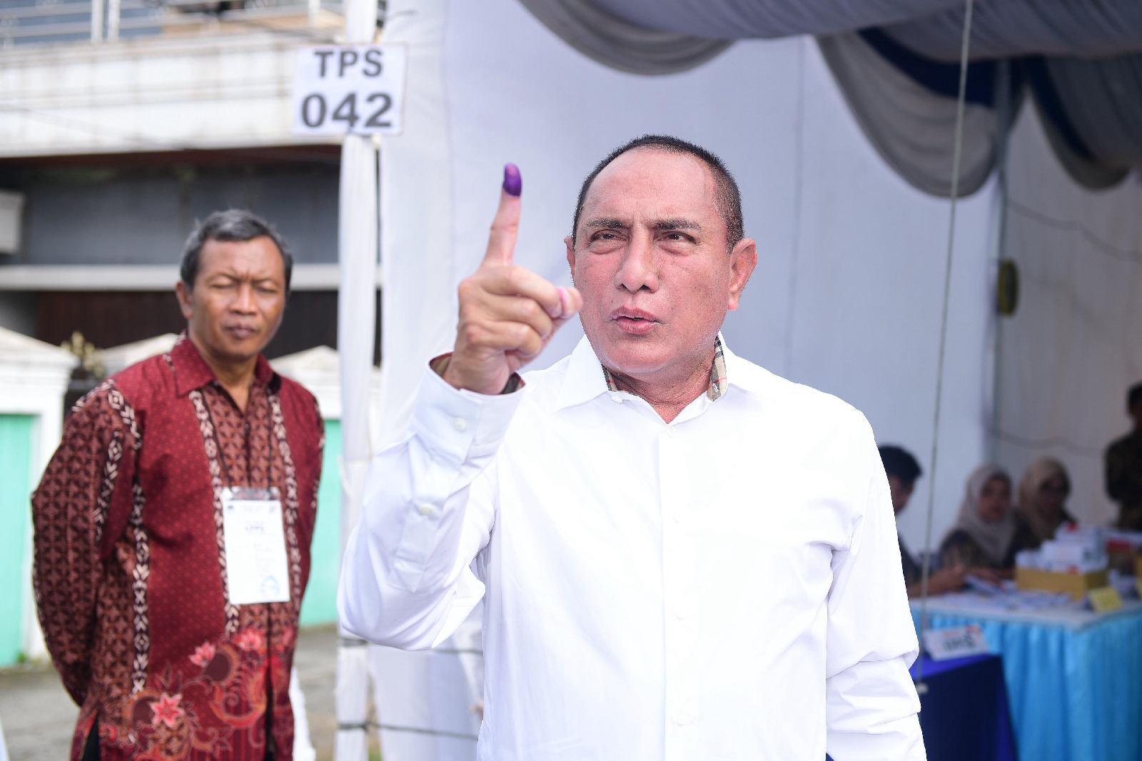 Diketahui, Edy Rahmayadi bersama istri menggunakan hak pilihnya di tempat pemungutan suara (TPS) 042, Jalan Karya Bakti, Kelurahan Pangkalan Masyur, Kecamatan Medan Johor, Kota Medan, Rabu (14/2/2024).