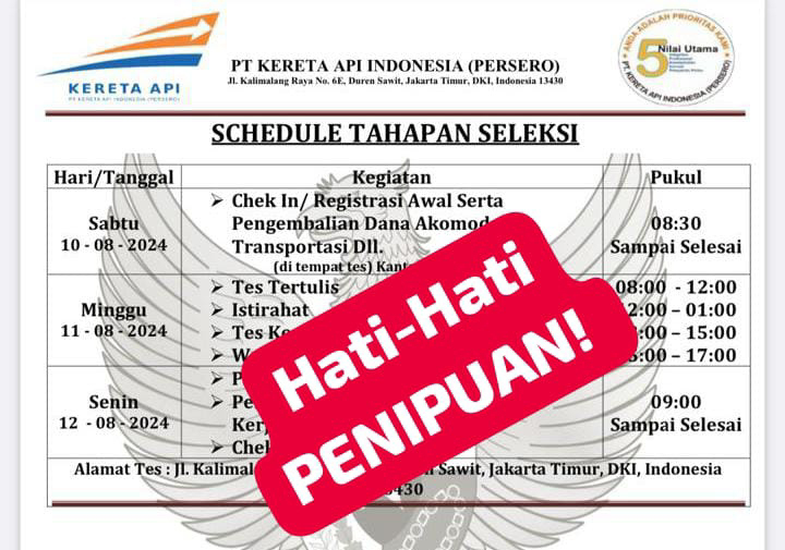 “Apabila menemukan informasi lowongan kerja KAI yang tidak bersumber dari kanal resmi tersebut seperti surat undangan rekrutmen atau bentuk lainnya diimbau untuk diabaikan, ” kata Anwar.